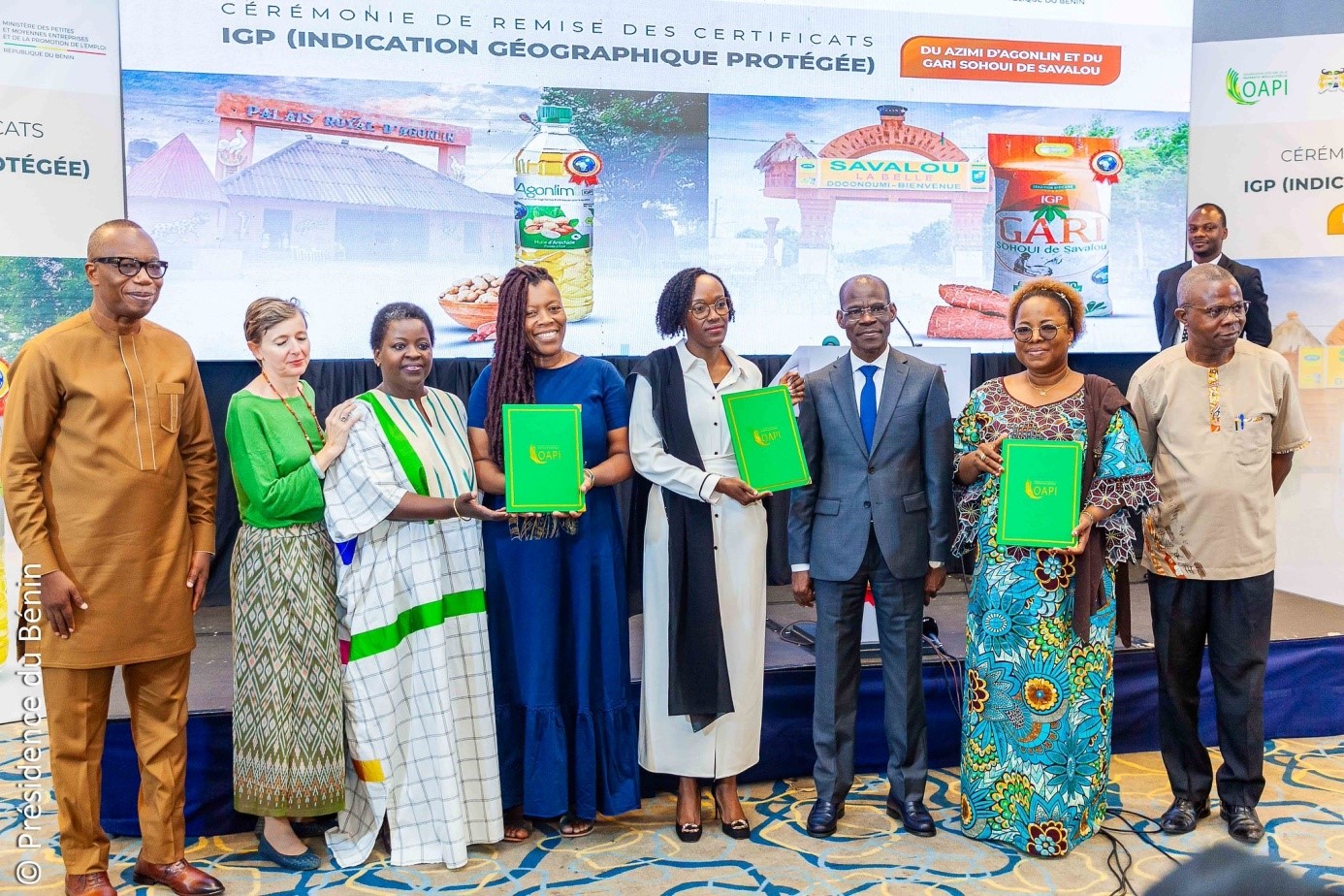 certificats IGP Cotonou a vibré au rythme du Consommons local lors de la cérémonie officielle de remise des certificats d’Indication Géographique Protégée (IGP) à deux produits emblématiques du Bénin : le Gari Sohoui de Savalou et l’Azimi d’Agonlin